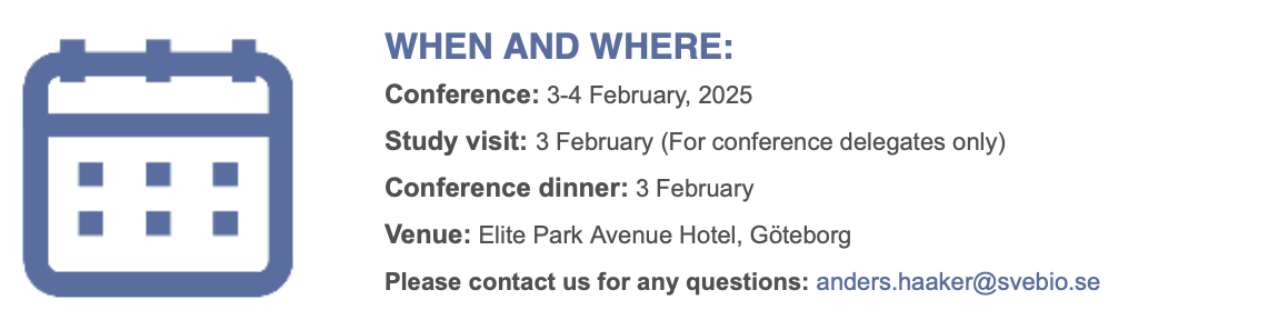 Konferensen äger rum 3-4 februari, 2025, på Elite Park Avenue Hotel i Göteborg. För frågor angående hotell, kontakta Maria Zettergren: maria.zettergren@svebio.se