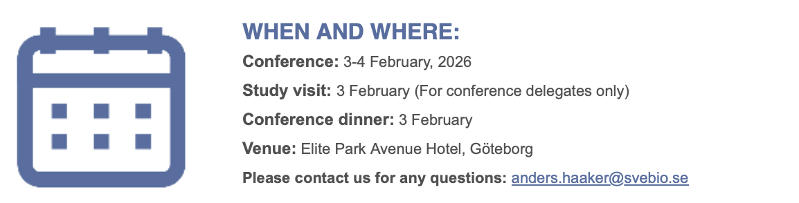 Konferensen äger rum 3-4 februari, 2026, på Elite Park Avenue Hotel i Göteborg. För frågor angående hotell, kontakta Maria Zettergren: maria.zettergren@svebio.se